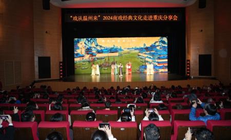 11月23日晚,“戏从温州来”2024南戏经典文化走进重庆专场演出在重庆大剧院中剧场举行。演出分《序》《经典咏流传》《东瓯戏韵长》《好戏“聚”川渝》《尾声》等5个篇章,呈现了一台集瓯剧、越剧、永昆、川剧、京剧、温州鼓词、木偶戏等多种艺术形式于一体的沉浸式戏曲晚会。